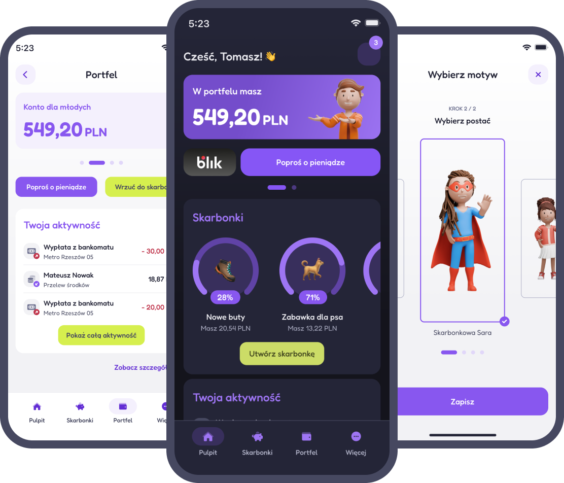 Łatwo sprawdza stan Portfela, aktywności na rachunku i informacje o karcie. Wybiera 1 z 4 towarzyszy bankowania i ma dostęp do      10 motyów kolorystycznych.